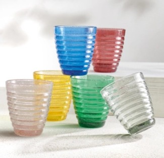 Set composto da 6 bicchieri colorati, uno diverso dall’altro (trasparente, rosa, blu, rosso, verde giallo).